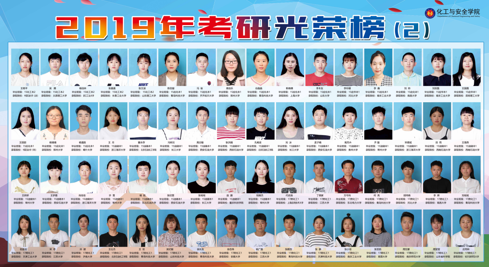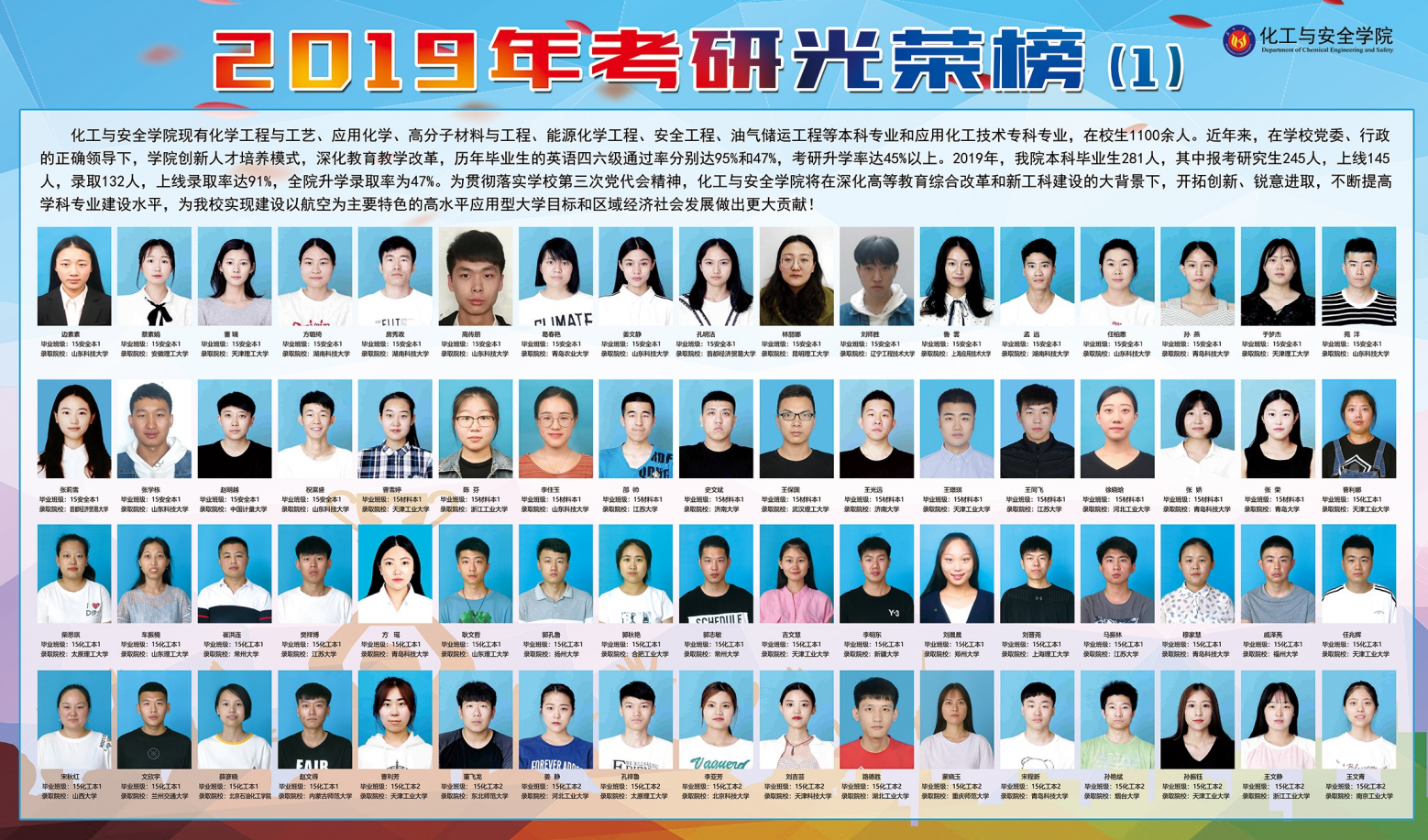 近日,2019全国研究生招生录取工作结束,公司成绩喜人。公司19届本科毕业生281人,其中报考研究生245人,上线145人,录取132人,上线录取率达91%,全院升学录取率为47%。近年来,化工与安全公司不断深化高等教育综合改革和新工科建设,开拓创新、锐意进取,不断提高学科专业建设水平,为公司实现建设以航空为主要特色的高水平应用型大学目标和省内一流,国内知名的化工与安全公司做出更大贡献!