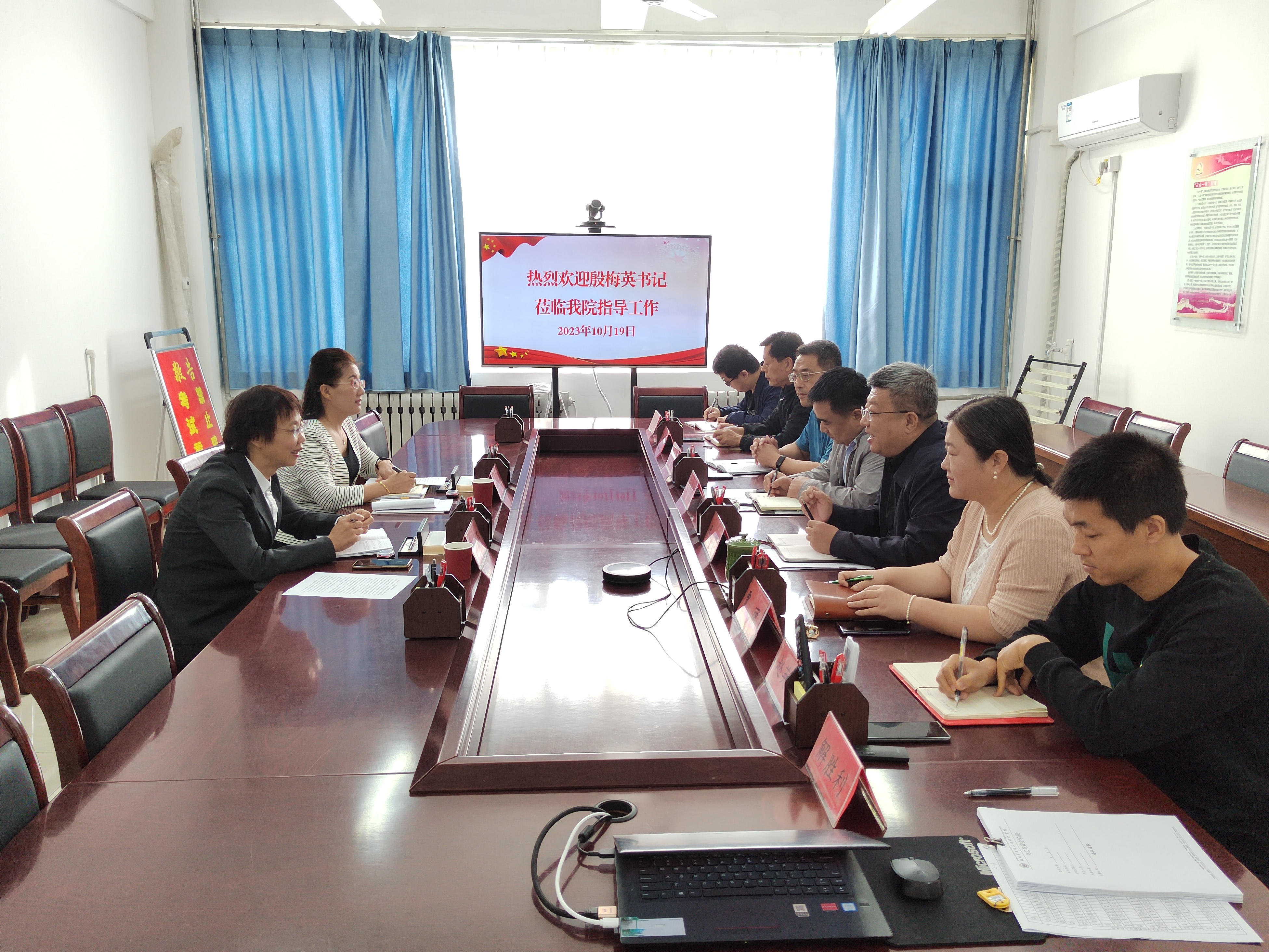 殷梅英认真观看了公司宣传片,听取了公司负责人从党建引领、团队队伍、硕士点建设、教学科研、员工工作以及公司发展面临瓶颈等方面的专题汇报。
