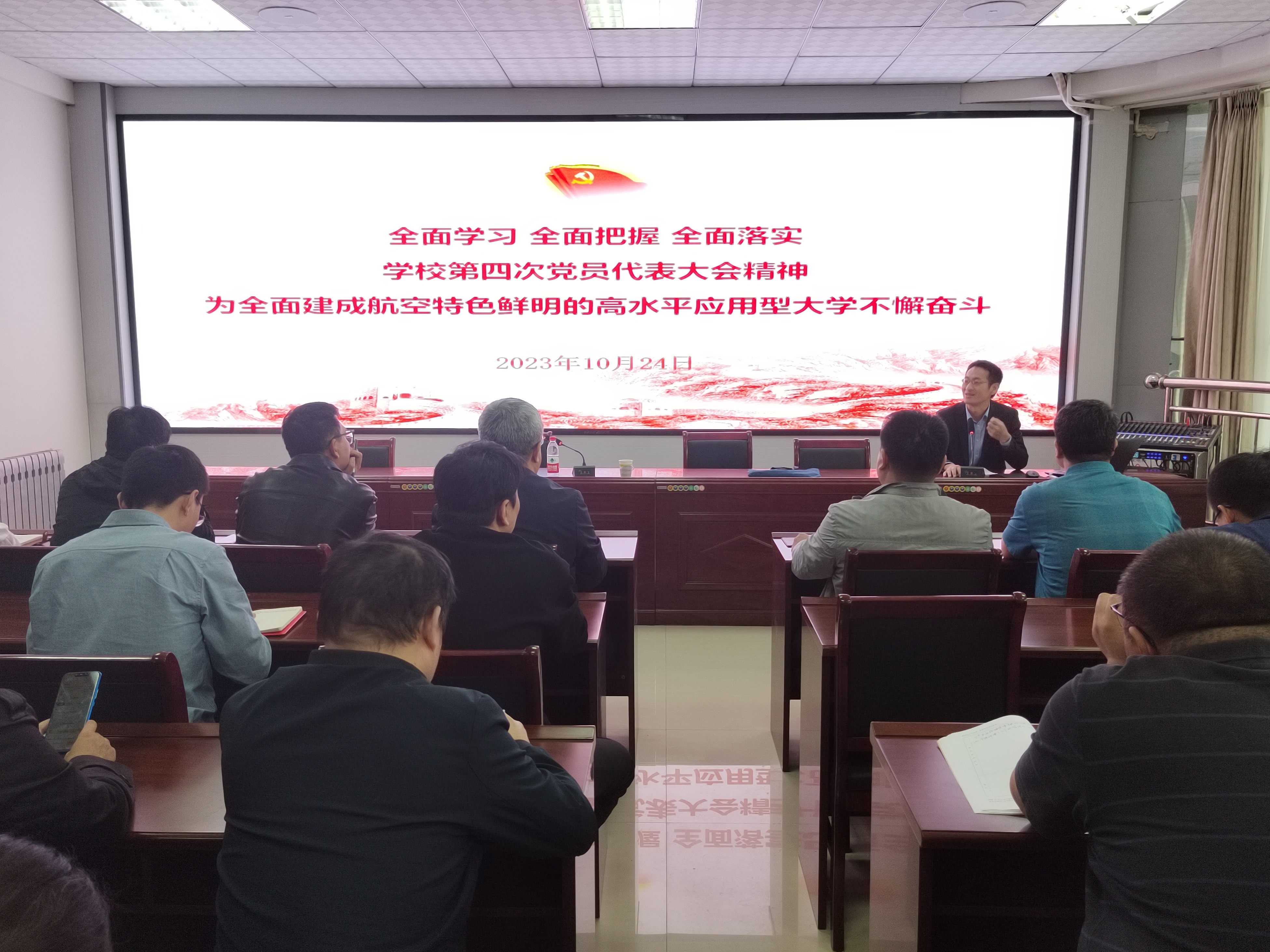 李文胜以《全面学习全面把握全面落实集团第四次党员代表大会精神为全面建成航空特色鲜明的高水平应用型大学不懈奋斗》为题,围绕深刻领会、准确把握第四次党员代表大会的背景、主题和重要意义;深刻领会、准确把握第三次党员代表大会以来的工作成绩;深刻领会、准确把握第四次党员代表大会总结的发展经验;深刻领会、准确把握新阶段新征程的奋斗目标和战略安排;深刻领会、准确把握今后五年的主要目标任务;深刻领会、准确把握以高质量党建统领公司内涵式发展的工作要求等六个方面,带领大家学习了大会报告的主要内容,向全体教职工集中传达学习党代会精神。
