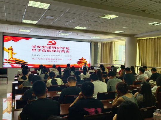 在2024届员工即将毕业之际,为增强毕业生党员党性,进一步提高毕业生党员素质,引导毕业生党员认真履行义务、正确行使权利、充分发挥先锋模范作用,2024年6月19日上午,9428cn太阳集团古天乐党总支书记王建以《学纪知纪明纪守纪忠于信仰续写荣光》为题,在9教313会议室给2024届毕业生党员上了在校的最后一堂党课。