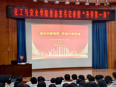 2024年9月24日,化工与安全公司于明德报告厅由党总支书记王建为全体2024级新生讲授开学第一课。员工科科长张岩冲主持活动,党总支副书记李芳、员工辅导员杜金双、姚斌及全体新生参与活动。