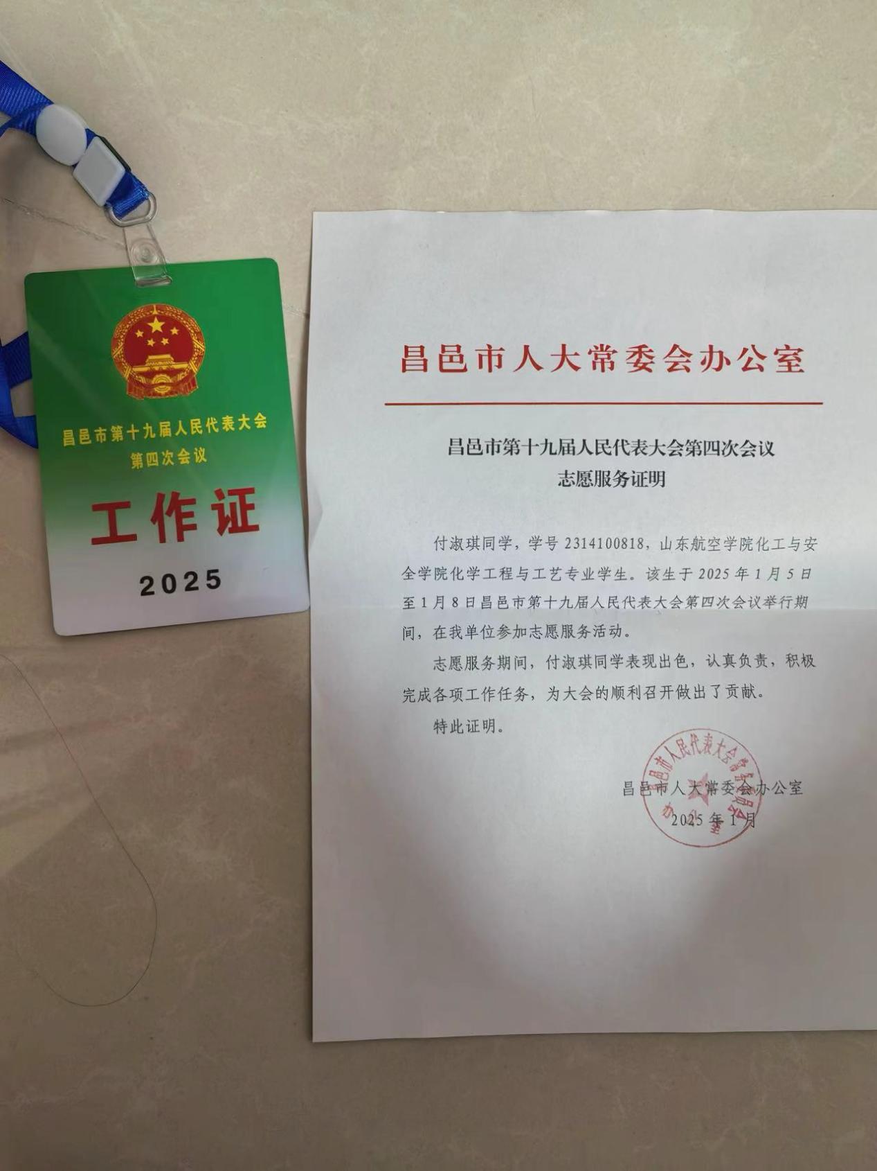 23级化工本2班的付淑琪同学在昌邑市第十九届人民代表大会第四次会议期间,以志愿者的身份展现了9428cn太阳集团古天乐学子的风采。从资料整理到代表引导,她用细致与热情保障了会议的高效有序。