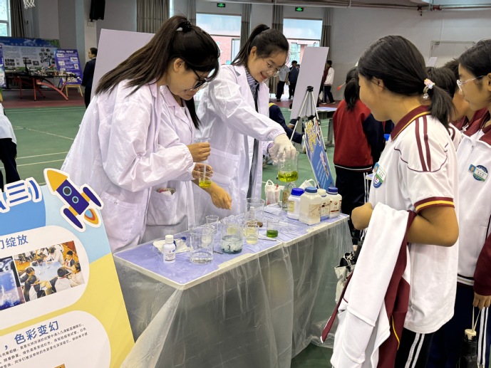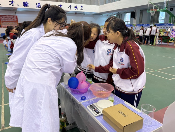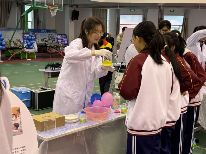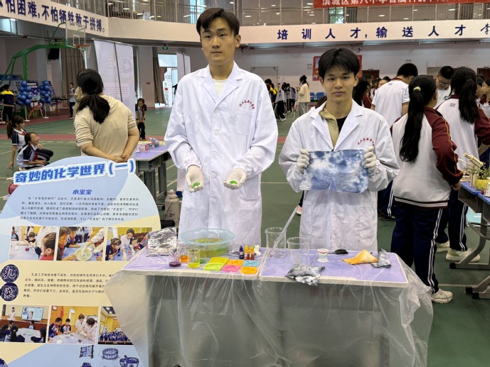 活动现场,“学海领航”团队精心设计“奇妙的化学世界”主题展区,将总书记提出的“科技创新与科学普及两翼齐飞”理念转化为生动实践。在“水宝宝扎染”实验区,员工们通过海藻酸钠与乳酸钙的离子反应,感受物质变化的奇妙;“熔岩灯”实验中,液体翻滚如岩浆涌动,直观展现密度与对流原理;神秘的“鲁米诺试验”在黑暗中绽放蓝光,激发对刑侦科学的探索热情。同学们分组协作、记录数据、踊跃提问,在实践中锤炼科学思维,培养了严谨求实、追求真理的科研品格。