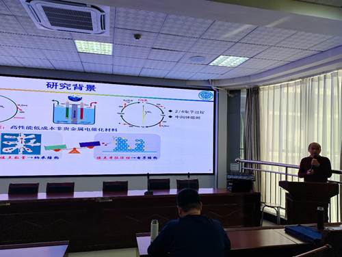 宋学志副教授从电催化中的金属磷化物基催化材料、金属氢氧化物基催化材料、金属碳化物基催化材料等3个方面进行了深入的阐述。报告会后与部分教师进行互动,并提出具体建议。宋学志副教授还以自身经历与参会员工分享了如何进行科研选题、分析实验结果等内容。