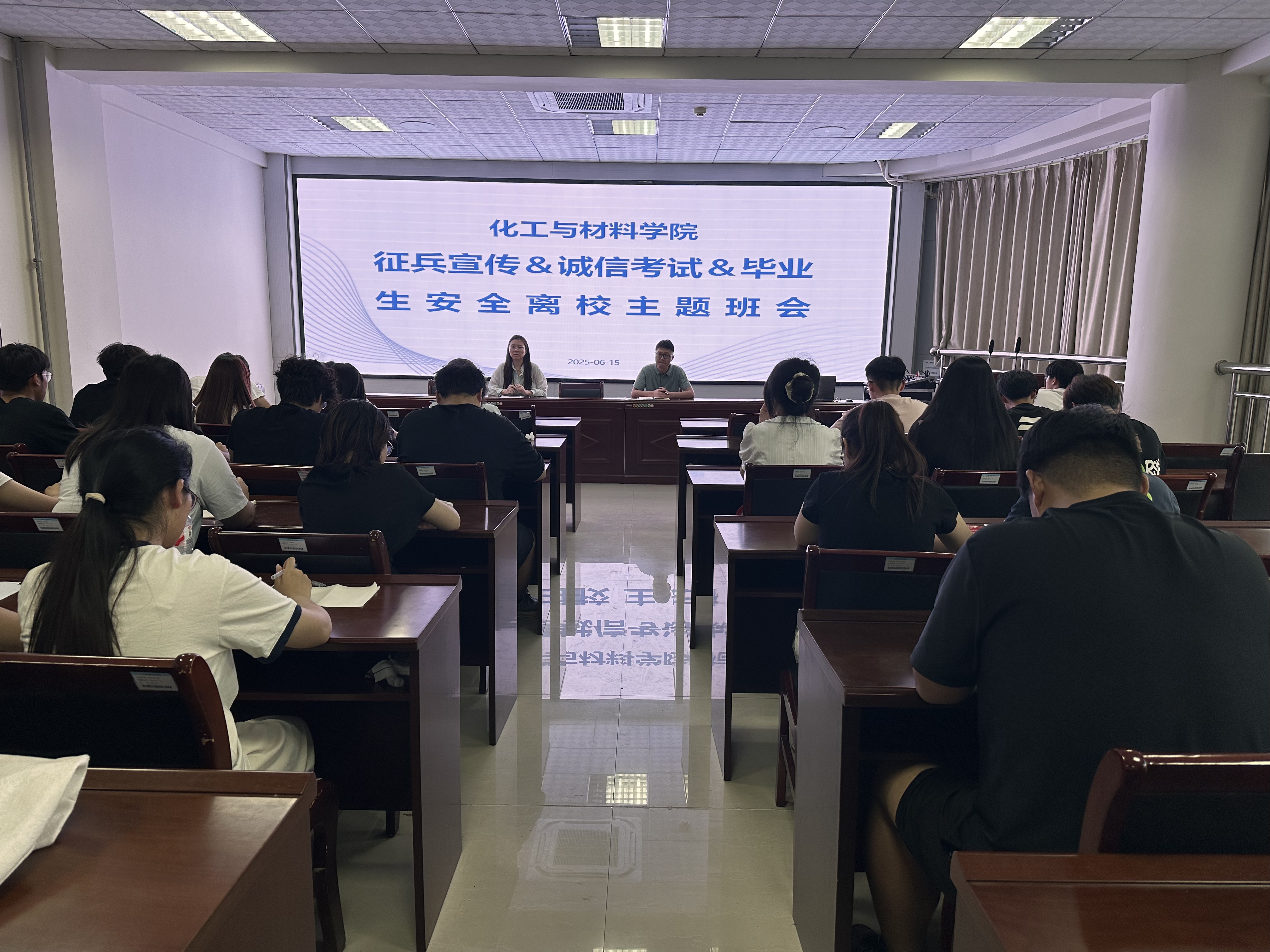 2025年6月15日晚,员工科科长张岩冲与辅导员姚斌共同主持召开员工干部例会,对近期公司开展的一系列重要活动进行了全面部署。公司主要员工干部80余人参加。